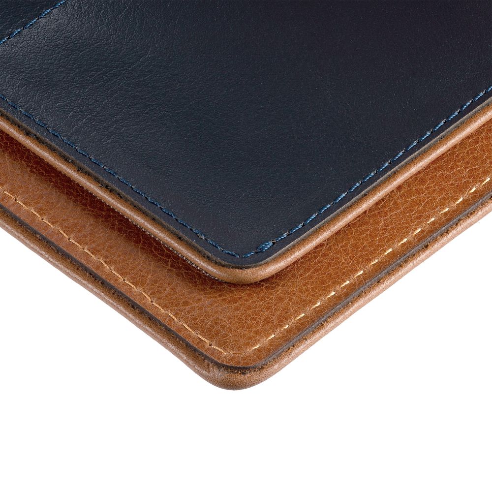 Чтобы передать этот удивительный контраст, для изделий Kalsa Palermo была выбрана гладкая натуральная кожа: глубокого синего цвета снаружи и светло-коричневого оттенка внутри. Оформленные в едином стиле, они легко собираются в подарочные наборы.