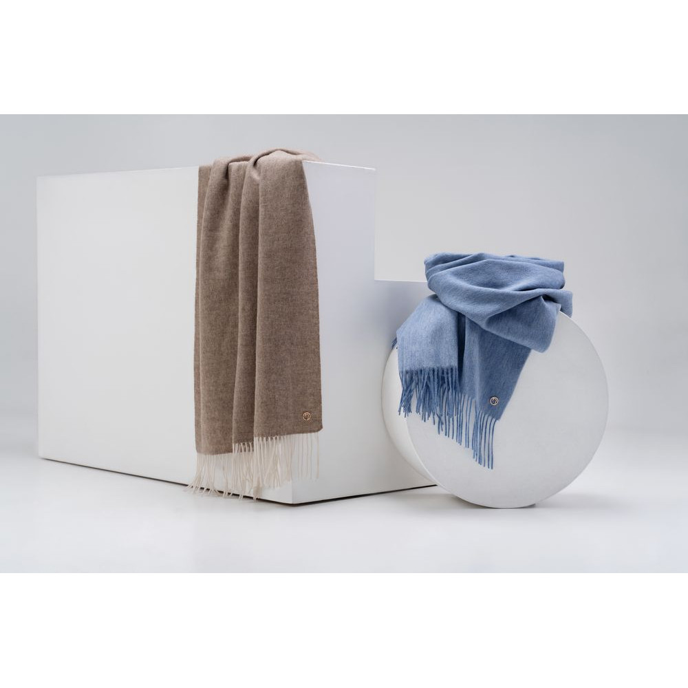 Широкий палантин с едва заметным узором плетения открывает простор фантазии — его можно использовать как шарф, головной убор или декоративный элемент для верхней одежды.