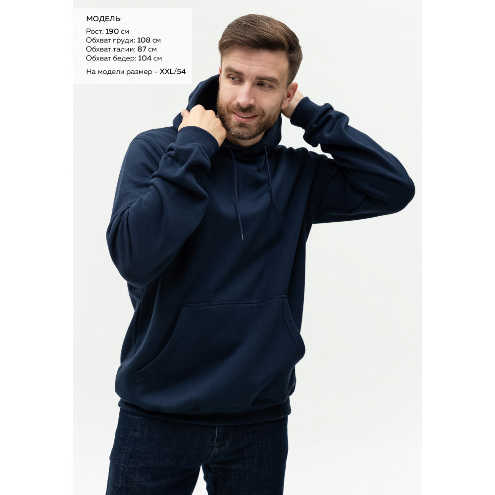 Размер мужского худи: XXL/54. Параметры модели: рост 190 см.; обхват груди 108 см.; обхват талии 87 см.; обхват бедер 104 см.