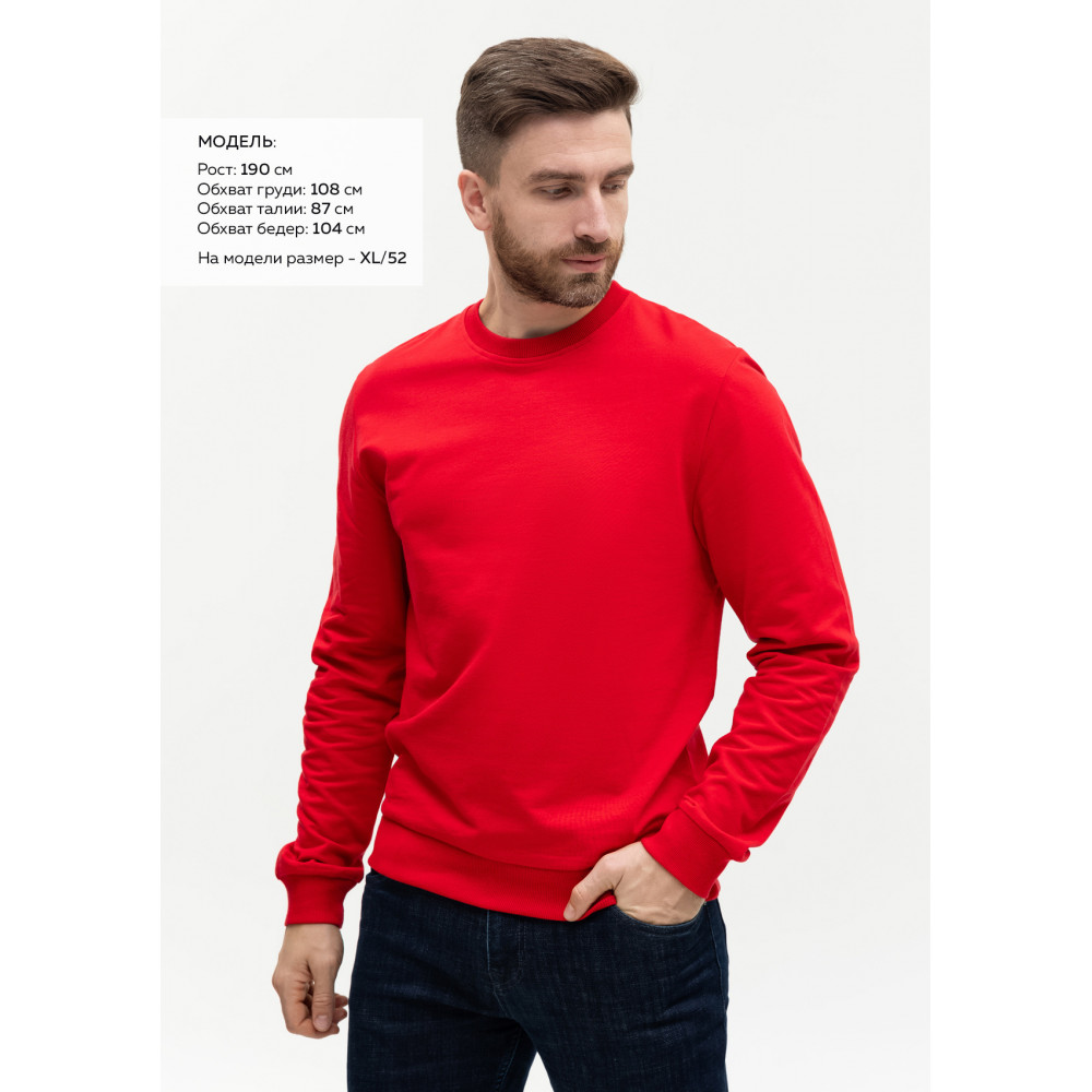 Размер мужского свитшота: XL/52. Параметры модели: рост 190 см.; обхват груди 108 см.; обхват талии 87 см.; обхват бедер 104 см.