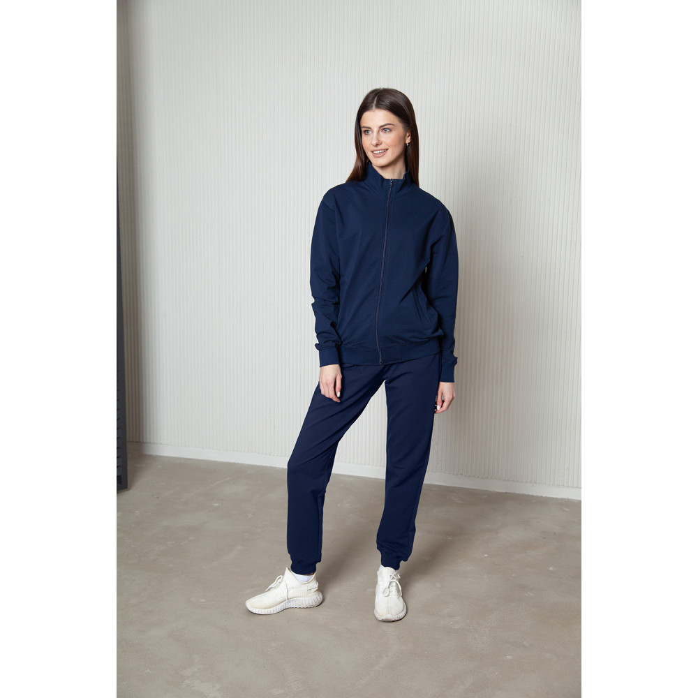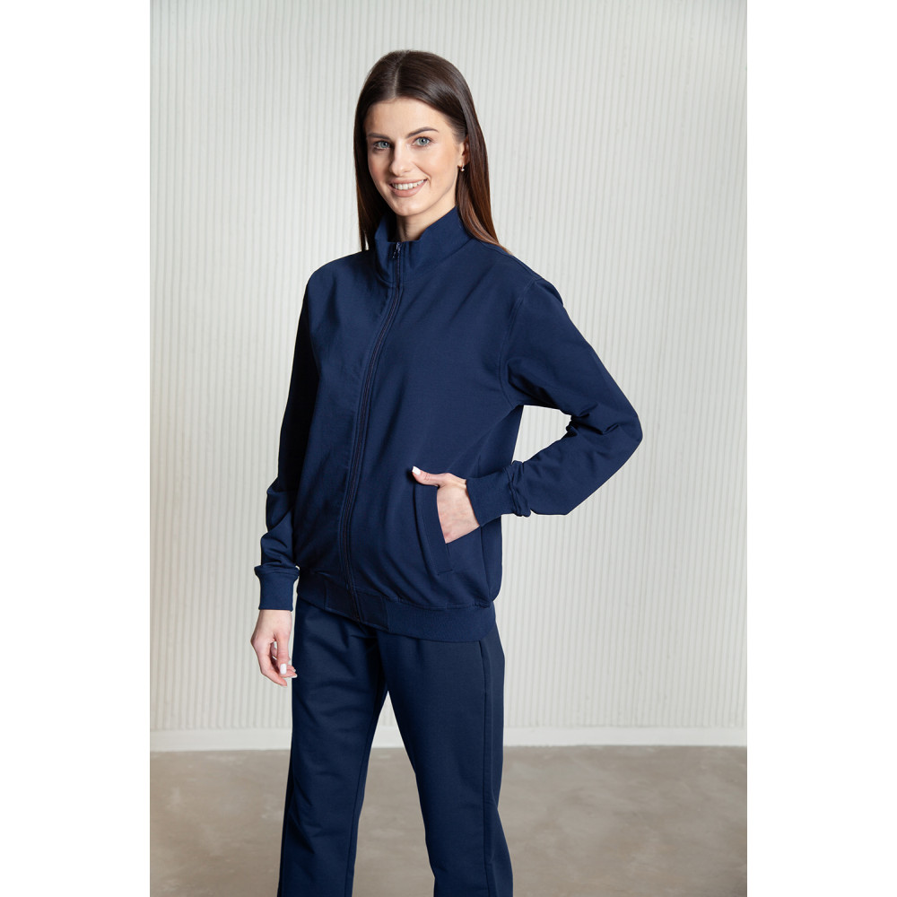 Олимпийка свободного силуэта с воротником-стойкой, втачным рукавом, прорезным карманом и застежкой на молнию. Манжет и низ изделия оформлены широкой эластичной резинкой в тон основному цвету.