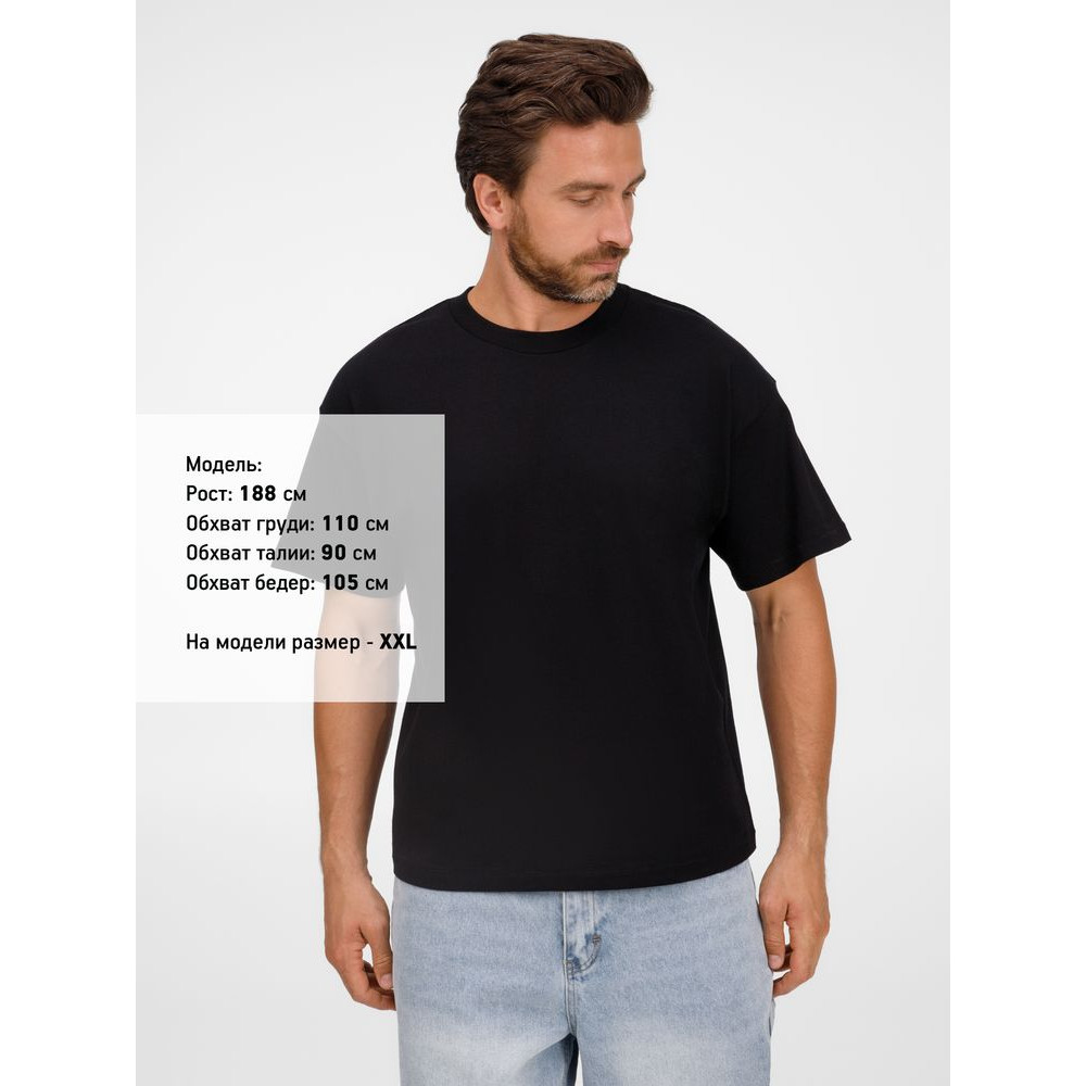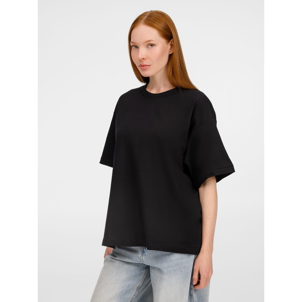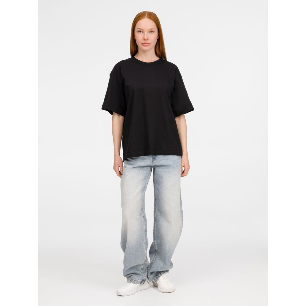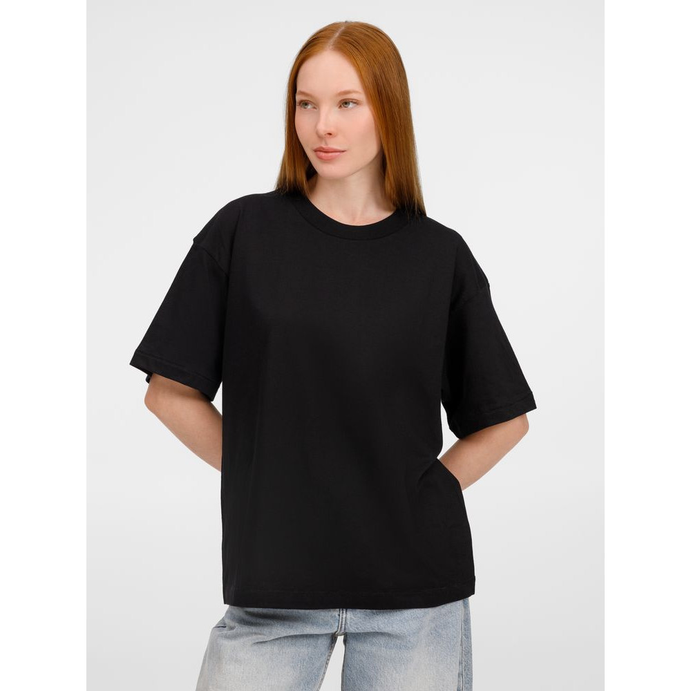 Футболка оверсайз унисекс с круглым вырезом и без боковых швов. Выполнена из смеси переработанного и обычного хлопка. Благодаря повышенной плотности отлично держит форму.