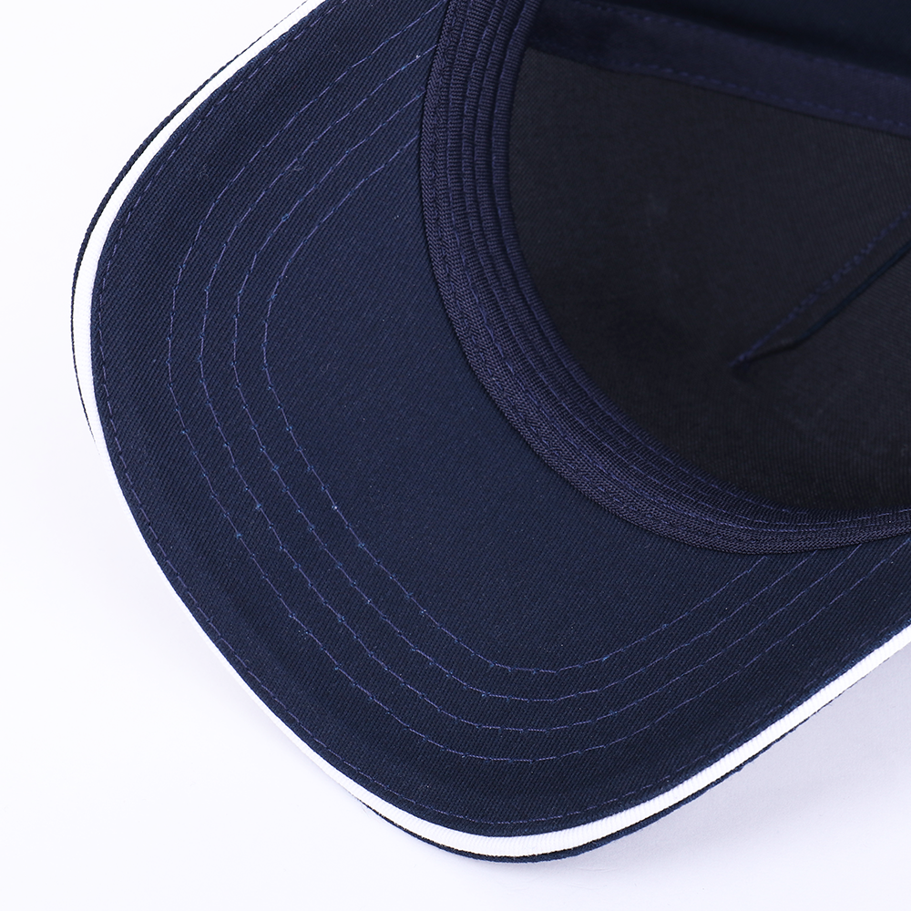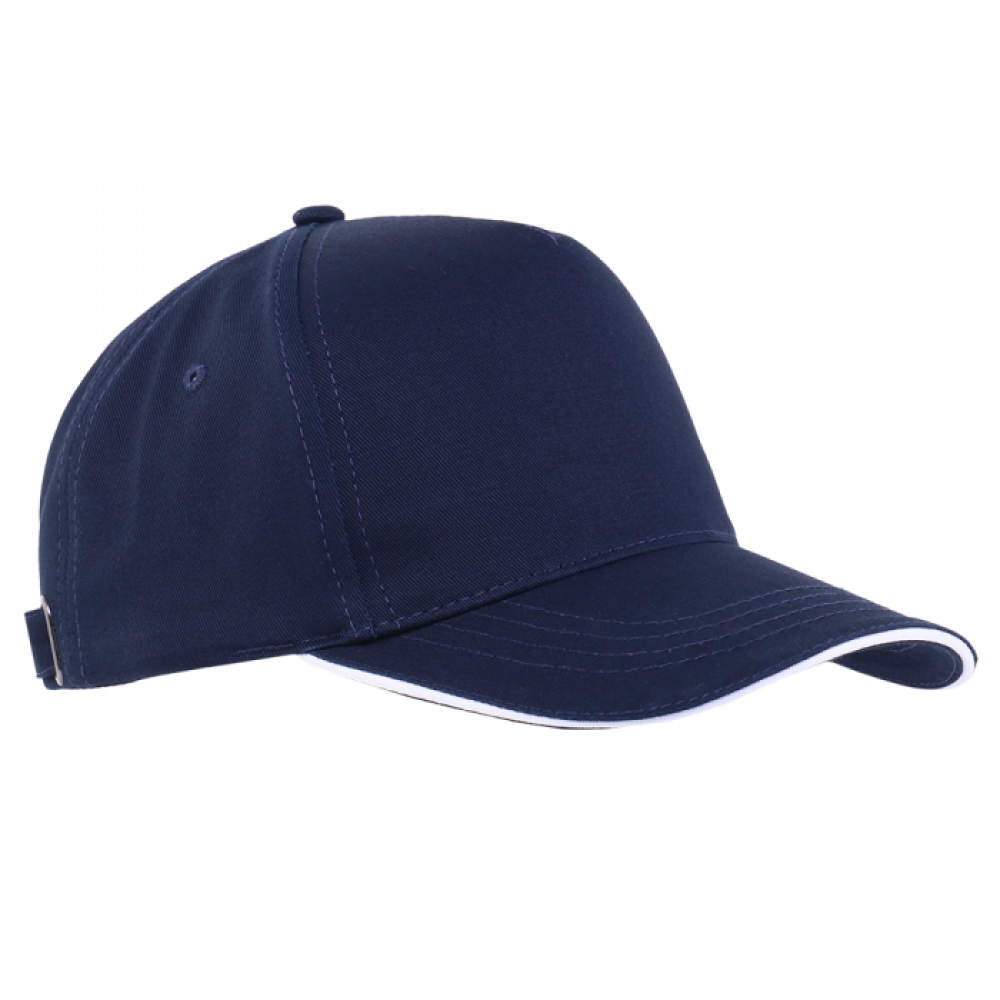 Пятиклиновый пошив, отсутствие лобового шва и изогнутый жесткий козырек «сэндвич» с контрастным кантом. Посадка регулируется ремешком с металлической застежкой.