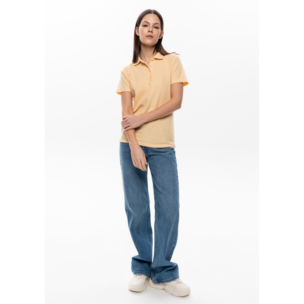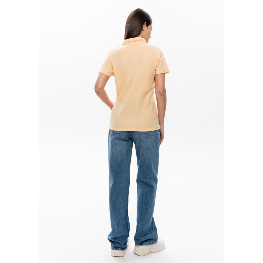 Женская рубашка поло приталенного силуэта с отложным воротником, втачным коротким рукавом и застежкой на пуговицы.