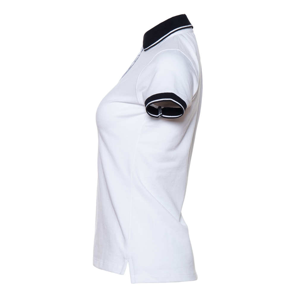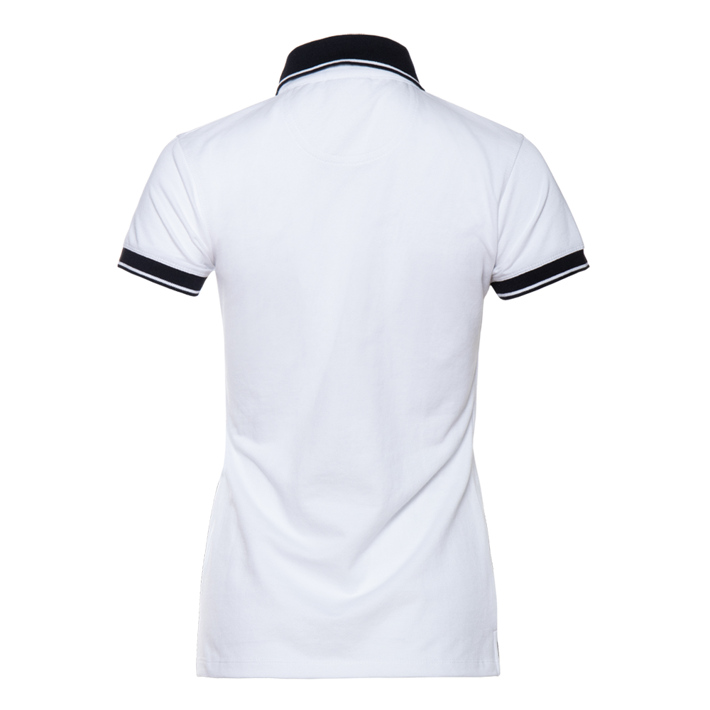 Женская рубашка поло приталенного силуэта с контрастным отложным воротником и манжетом, втачным коротким рукавом и застежку на пуговицы. Асимметричный крой гарантирует свободу движения и защиту спины от продувания ветром.